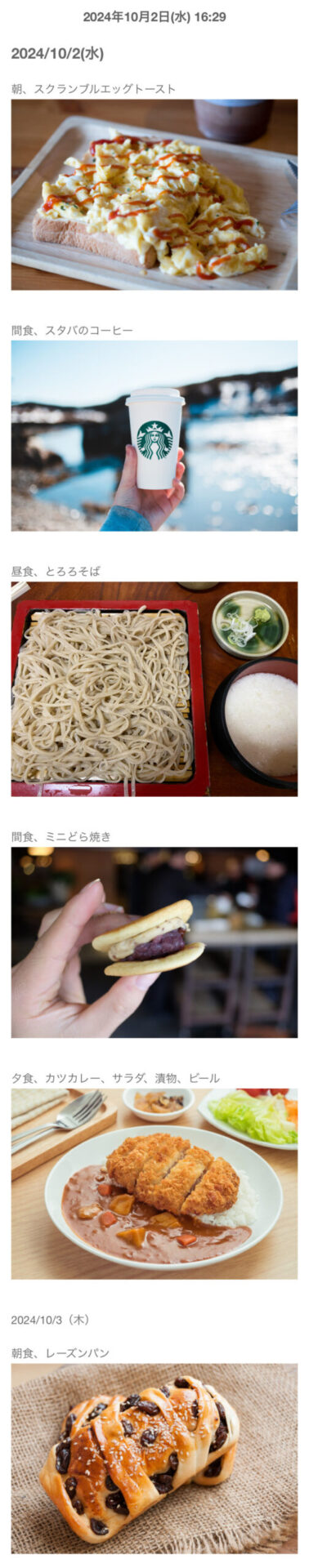 食事記録のやり方は、右にある画像のように、「日付」「いつ、何を食べた・飲んだ」が分かるようになっていればどんな形でも問題ありません。文章を打つのが面倒な場合は、写真を撮って貼り付けておくだけでも大丈夫です。もちろん、公開されることもありませんので、綺麗な写真じゃなくても全く問題ありません。